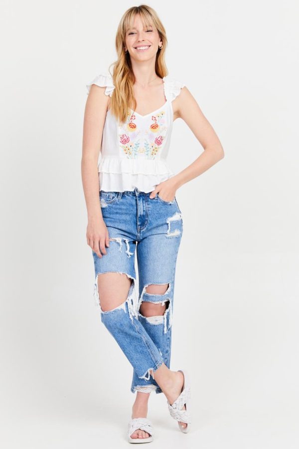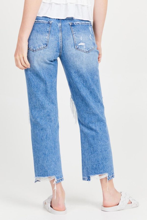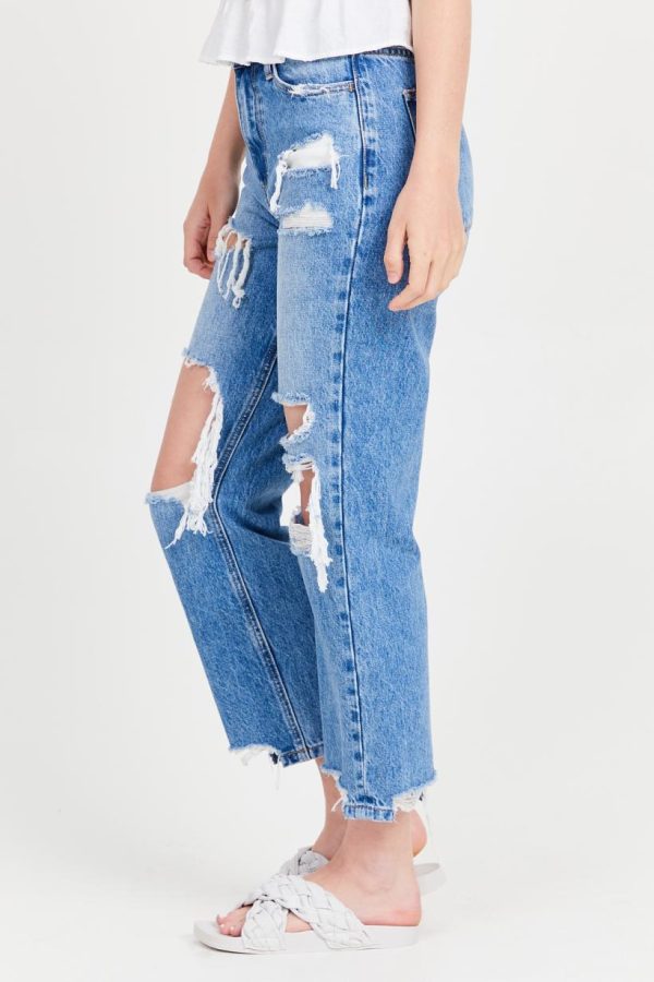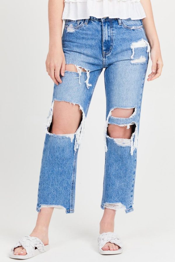 destroyed, high rise, straight leg jeans. an absolute staple for everyone’s closet! these compliment a cropped graphic tee, or a bodysuit so well. grab some sneakers and you have a perfect look for your day out!