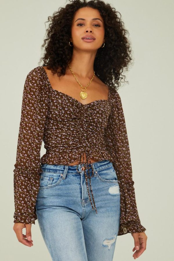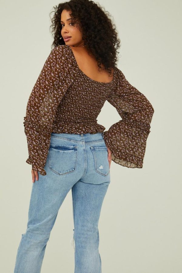Revamp your wardrobe with this cinched front blouse. Crafted with a tie cinch detail, this blouse adds a touch of creativity to your outfit, making an instant style statement. The flowy flared sleeves and ruffle hems create a sense of movement, while the smocked back ensures a comfortable fit. This blouse is perfect for those who embrace fashion-forward looks with ease.