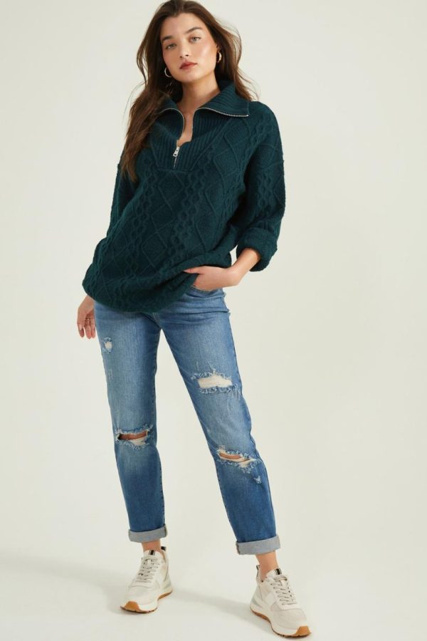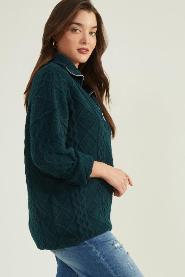 With its intricate cable knit pattern and soft texture, this sweater promises warmth and adorable style. The quarter zip neckline adds a contemporary twist to the classic tunic design, allowing for customizable comfort and effortless layering.