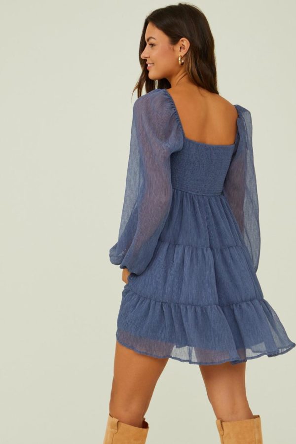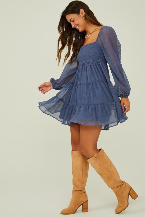 Experience a blend of comfort and style with this long-sleeved smocked dress, crafted from textured material and featuring a tiered skirt. This versatile dress effortlessly accompanies you anywhere, offering a casual yet chic option for any outing.